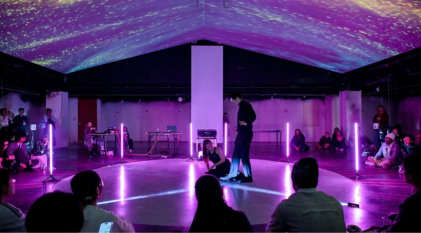 The performance unfolds gradually in four chapters: from the subtle resonance between the body and the soundscape of the four seasons, to the edge of the dream state of consciousness and subconsciousness; from the duet dance where a couple gradually disintegrates due to "time disqualification", all the way to the pure audio-visual field where modular synthesis and real-time visuals interweave.